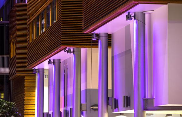 BI Oslo: Mood Lighting atmosphere at the Business Administration School Oslo.Concept by: Luminator SA. Photograph: Tomasz Majewski.Related fixtures:T-COLOR 6C rgbwauvT-BRIGHT 400 WBPARLED 200 PRO rgbw/fcPIN LIGHT Monochromatic BI Oslo - Norwegian Business School